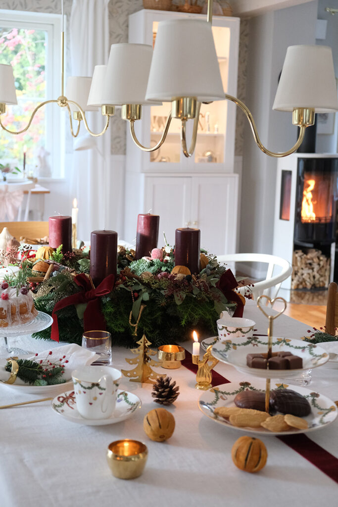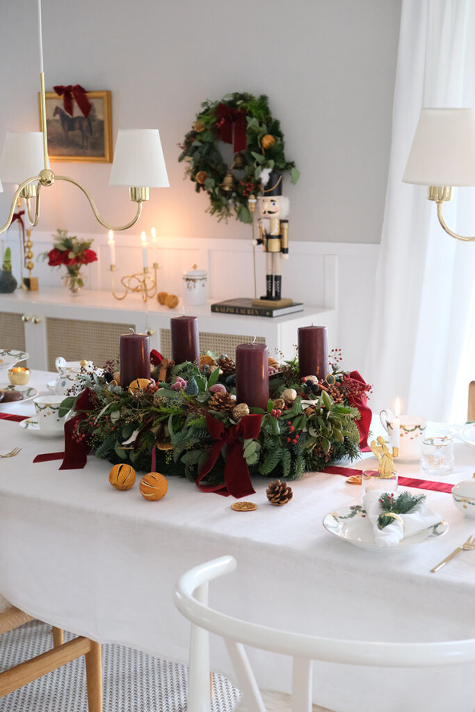 In diesem Jahr habe ich mir einen richtig großen, opulenten Adventskranz gebunden. Dunkelrote Kerzen, dunkelrote Samtschleifen, getrocknete Orangenscheiben, Zapfen, Beeren und goldene Walnüsse, die ich selbst angemalt habe. Er sollte üppig sein, aber trotzdem natürlich wirken.