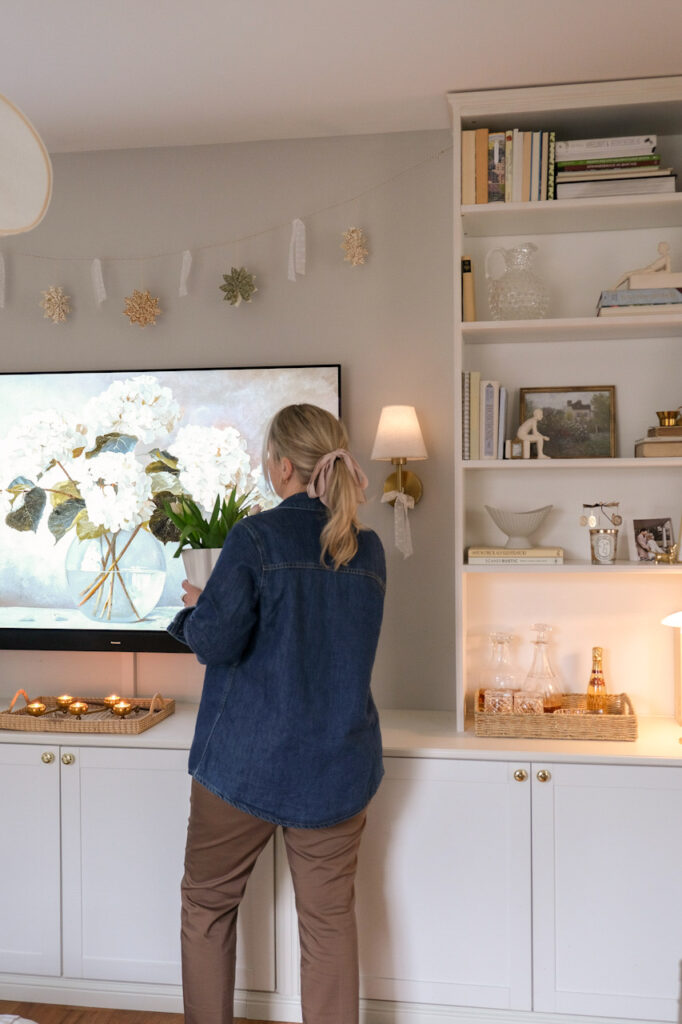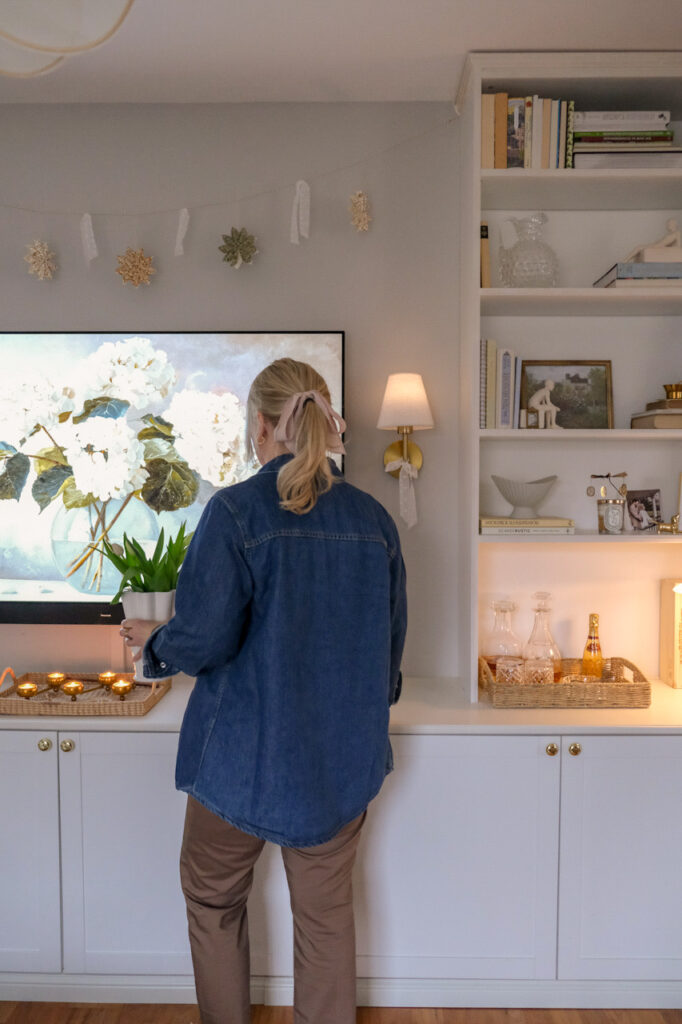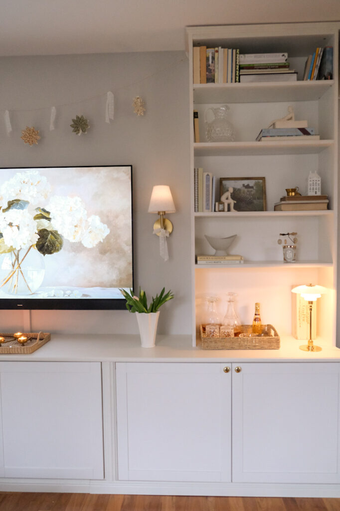 Unsere Wohnwand basiert auf einer Kombination aus drei Besta Unterschränken und zwei Billy Regalen, die wir rechts und links darauf gesetzt haben. Verbunden wird alles durch eine MDF Platte, deren Kante wir mit einer Fräse abrunden ließen, damit die Oberfläche weicher wirkt und sich harmonisch ins Gesamtbild einfügt. Kleine goldene Knöpfe sorgen zusätzlich für ein elegantes Detail und geben dem Ganzen einen individuellen Charakter.