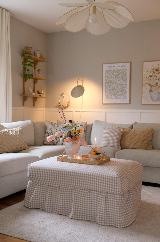 Vor Kurzem habe ich außerdem die selbst genähte Husse für meinen Pouf wieder hervorgeholt und ihn mit einem neuen Holztablett kombiniert, das ein wunderschönes Wellenmuster hat. Darauf finden Kerzen, Vasen oder auch mal Getränke Platz, perfekt für entspannte Abende.